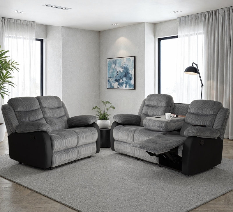 Ronan 3+2 reclining chairs grey cord fabric and faux black leather